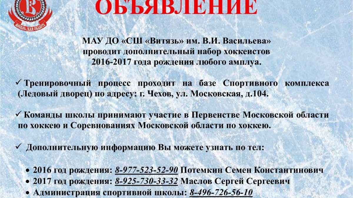 МАУ ДО «СШ «Витязь» объявляет дополнительный набор мальчик 2016-2017 года рождения в отделение «хоккей».
